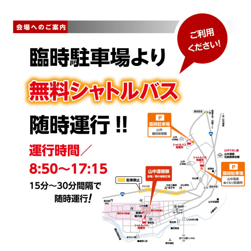 『山中漆器祭』開催期間中は、臨時駐車場から山中漆器祭り会場の「菊の湯前広場」まで無料シャトルバスが随時運行します