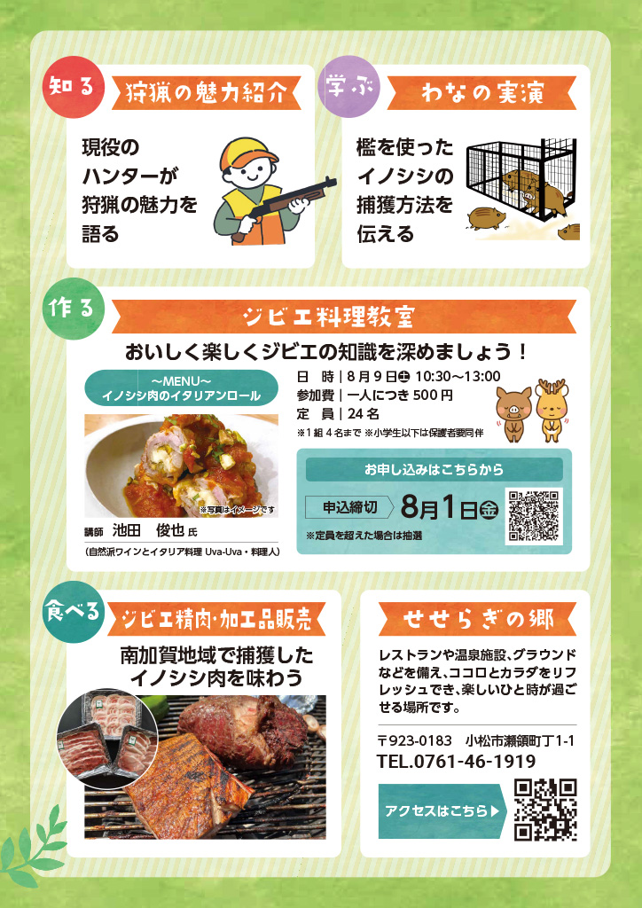8月9日(土)に石川県小松市の「せせらぎの郷」にて『狩猟体験フェスタ~自然と命にふれる~』が開催されます