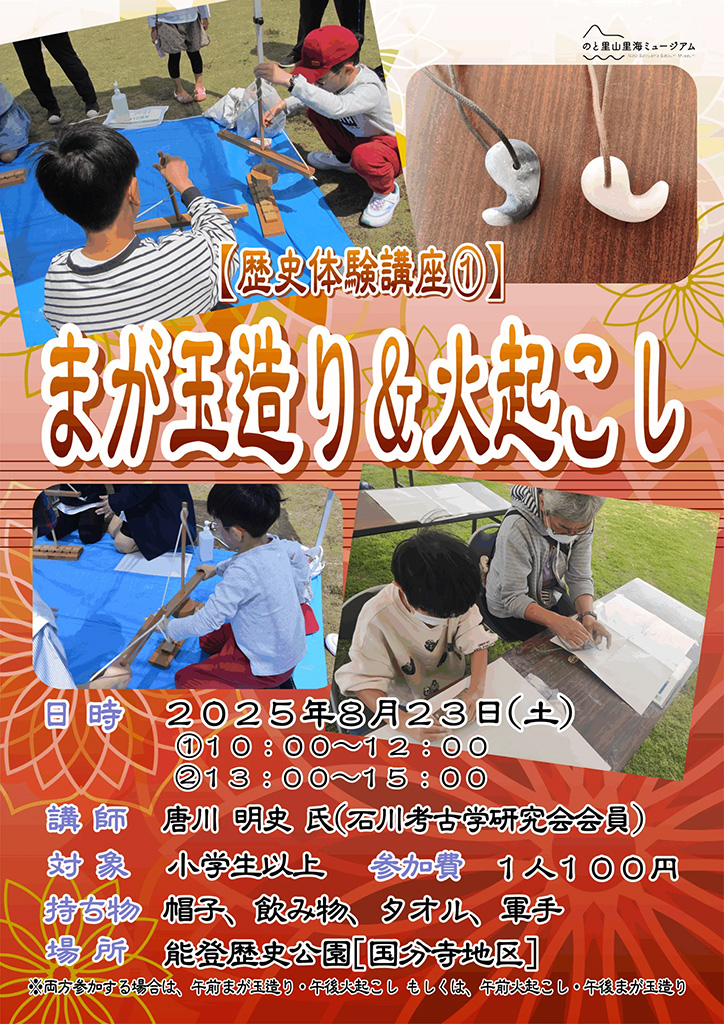 公式サイトhttps://noto-museum.jp/【歴史体験講座】まが玉造り&火起こし/