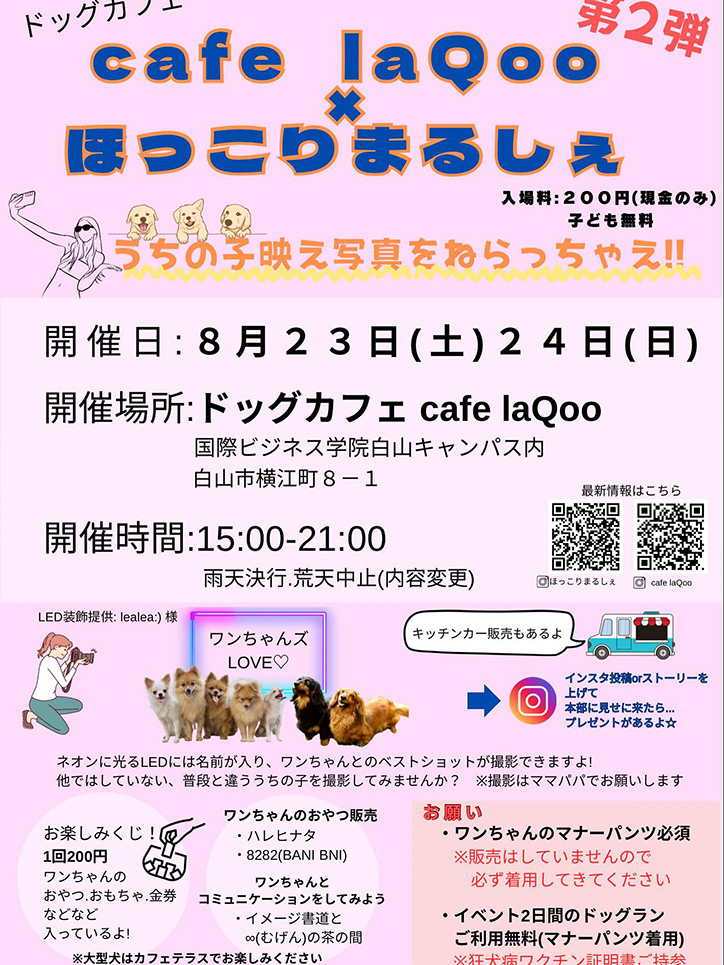 8月23日(土)、8月24日(日)に石川県白山市の国際ビジネス学院 白山キャンパス敷地内にある「ドッグカフェcafe laQoo」にて『ほっこりまるしぇ×ドッグカフェcafe laQoo』が開催されます