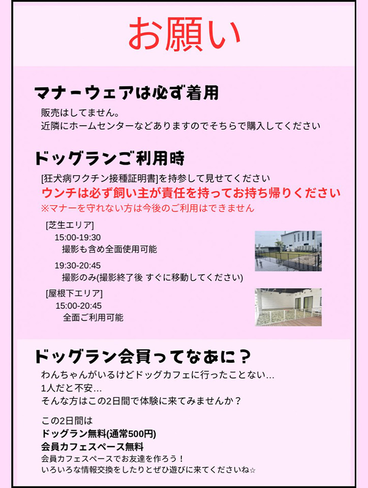 入場料 | 200円(子ども無料) ※当日ドッグラン会員(2,500円)入会可能 |