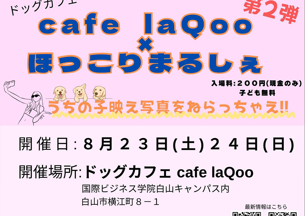 8月23日(土)、8月24日(日)に石川県白山市の国際ビジネス学院 白山キャンパス敷地内にある「ドッグカフェcafe laQoo」にて『ほっこりまるしぇ×ドッグカフェcafe laQoo』が開催されます