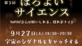 - [9/27]第3回 ほろよいサイエンス「宇宙のシグナルをキャッチする ~電波天文学の最前線へ~」が森町壱番丁で開催(金沢)