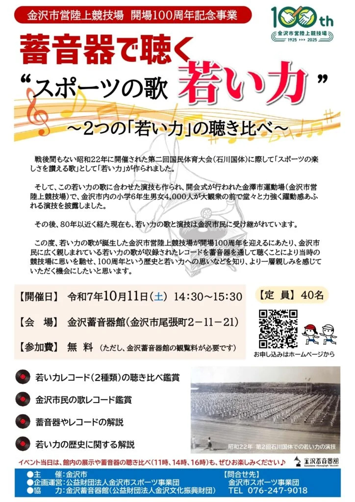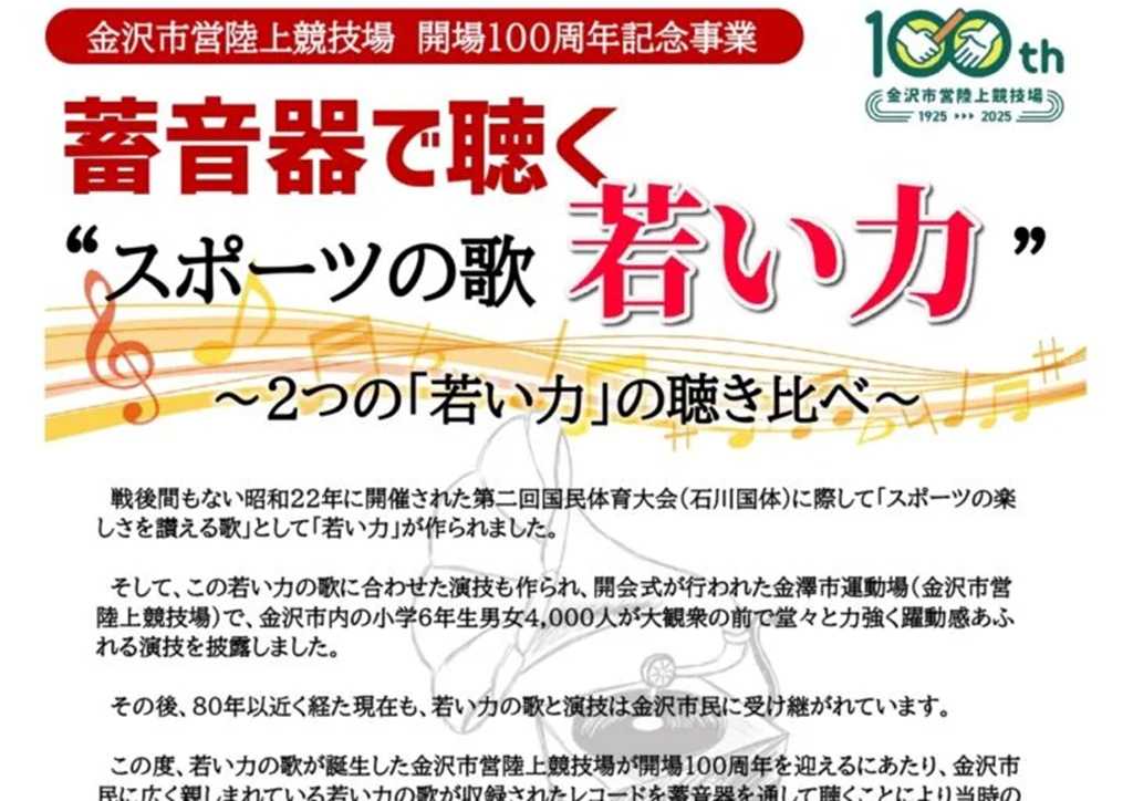 「若い力」が誕生した金沢市営陸上競技場が開場100周年を迎えるにあたり、記念事業として金沢市民に広く親しまれている「若い力」を蓄音器を通して聴くイベントが開催されます