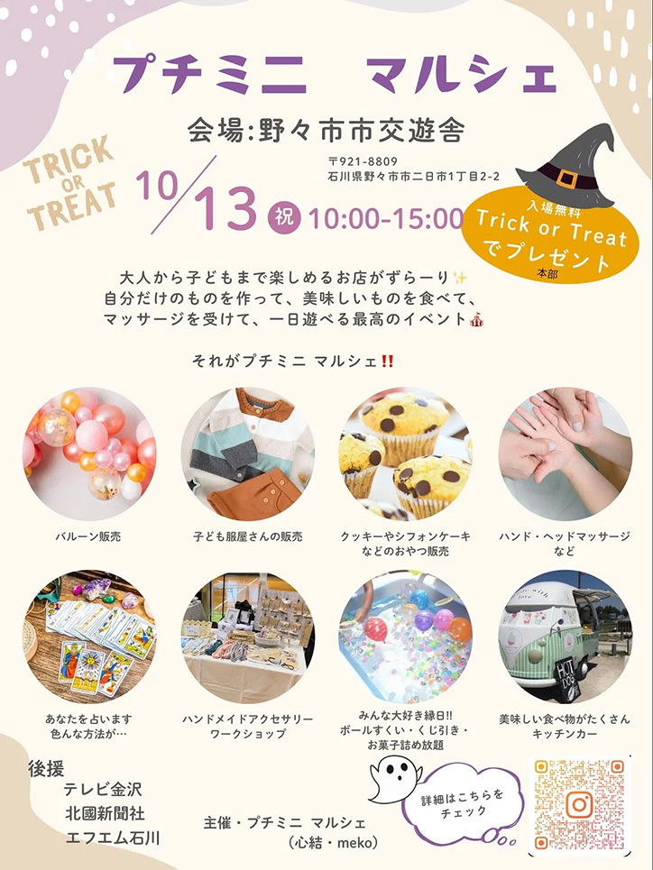 10月13日(月祝)に石川県野々市市の「野々市市交遊舎」にて『プチミニマルシェin野々市市交遊舎』が開催されます