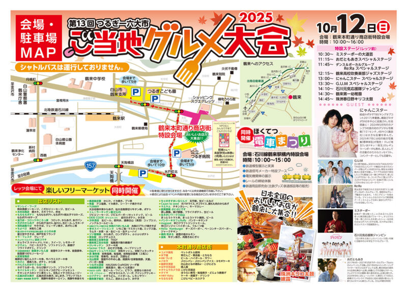 ※北陸鉄道石川線で『ご当地グルメ会場』へお越しの方には帰りの無料切符(当日のみ有効)を特設会場総合案内所にて差し上げます(小学生は往復無料)