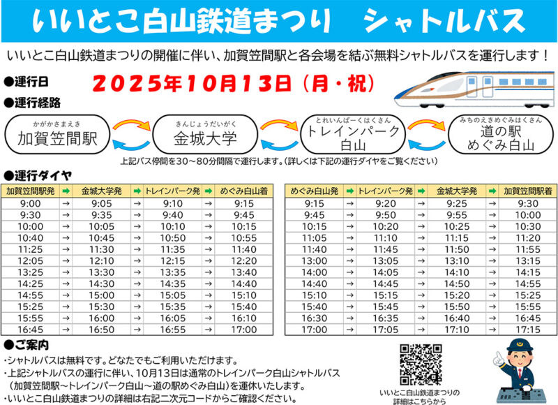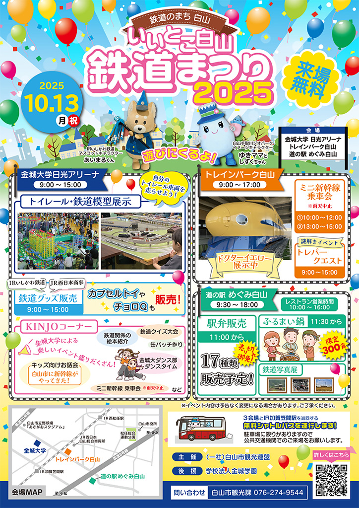 『いいとこ白山鉄道まつり』が石川県白山市の「金城大学 笠間キャンパス」、「トレインパーク白山」、「道の駅 めぐみ白山」の3会場で2025年10月13日(月祝)に開催されます