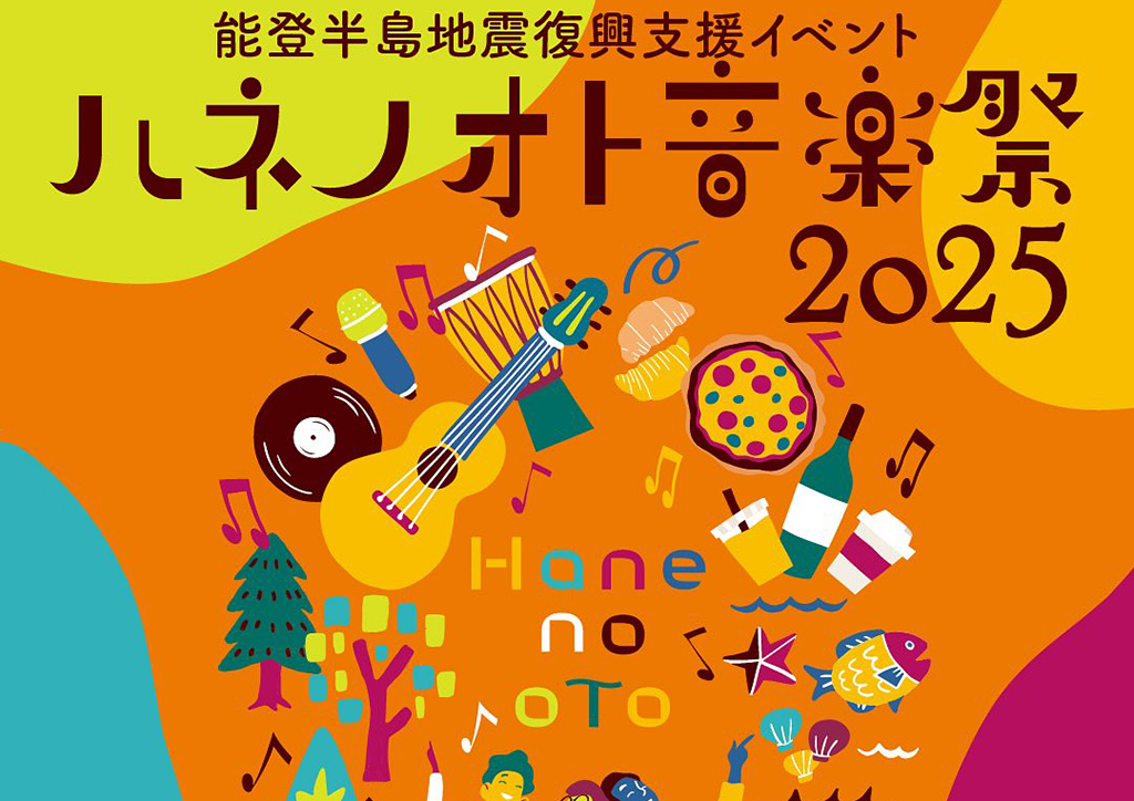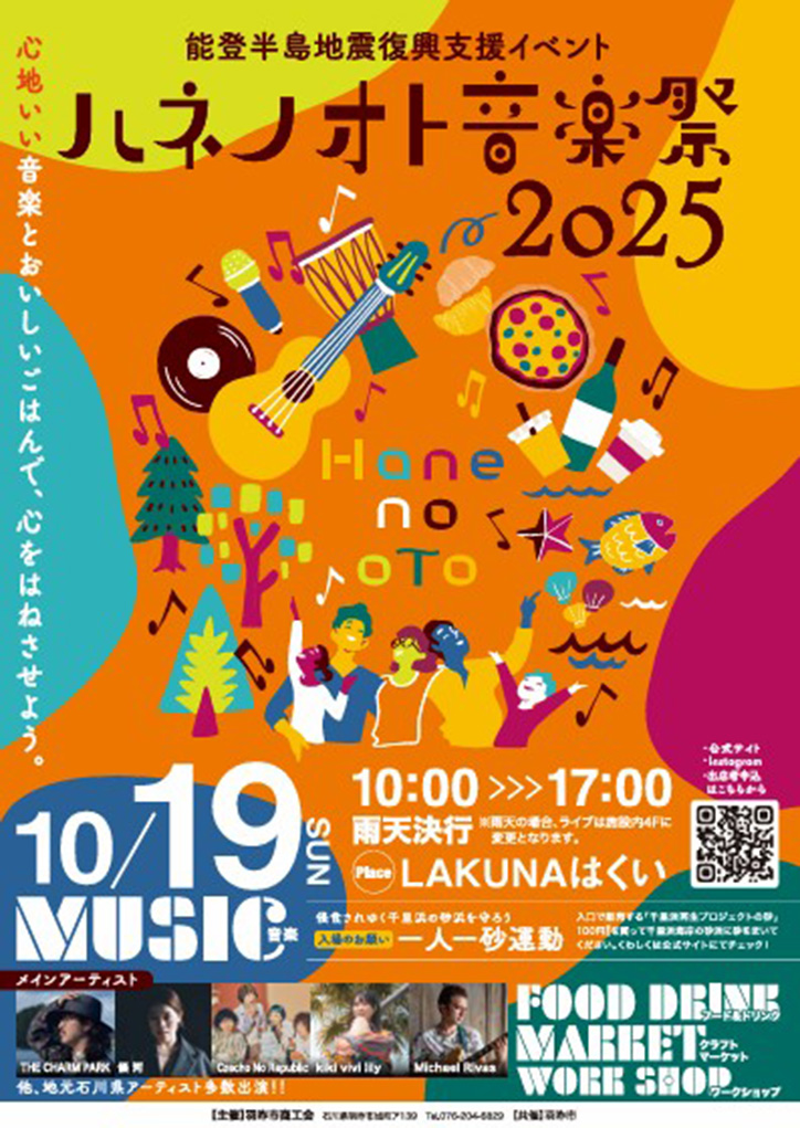 10月19日(日)に石川県羽咋市の「LAKUNAはくい」にて能登半島地震復興支援イベントとして『ハネノオト音楽祭2025』が開催されます