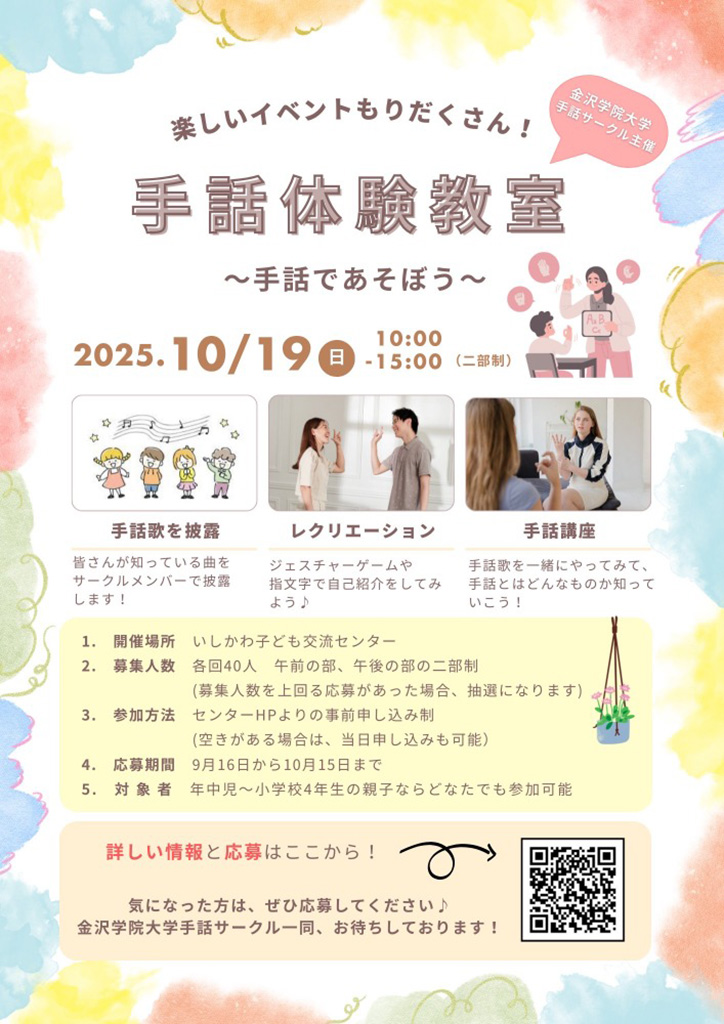 『手話体験教室~手話であそぼう!~』が石川県金沢市の「いしかわ子ども交流センター」で2025年10月19日(日)に開催されます