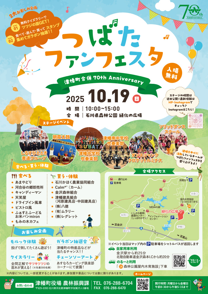 『津幡町合併70周年記念イベント「つばたファンフェスタ」』が石川県河北郡津幡町の「石川県森林公園 緑化の広場」で2025年10月19日(日)に開催されます