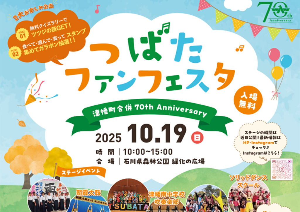 『津幡町合併70周年記念イベント「つばたファンフェスタ」』が石川県河北郡津幡町の「石川県森林公園 緑化の広場」で2025年10月19日(日)に開催されます