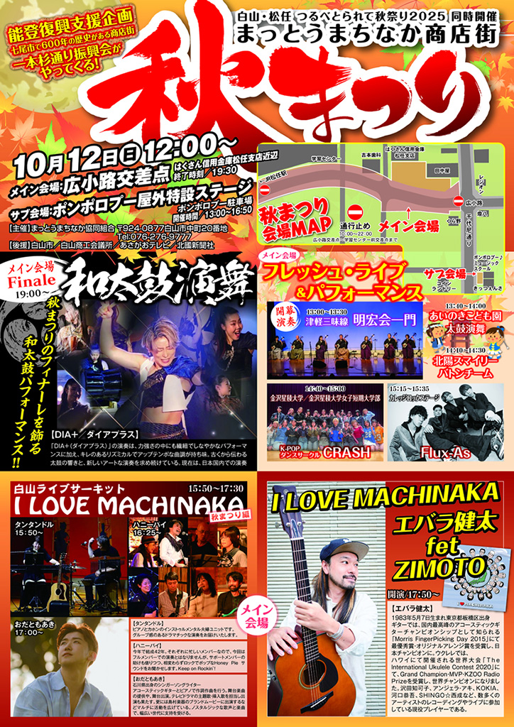 開催場所 | [メイン会場] 広小路交差点(はくさん信用金庫松任支店近辺) (〒924-0884 石川県白山市東新町4 周辺) [サブ会場] ポンポロプー屋外特設ステージ (〒924-0877 石川県白山市中町30) |