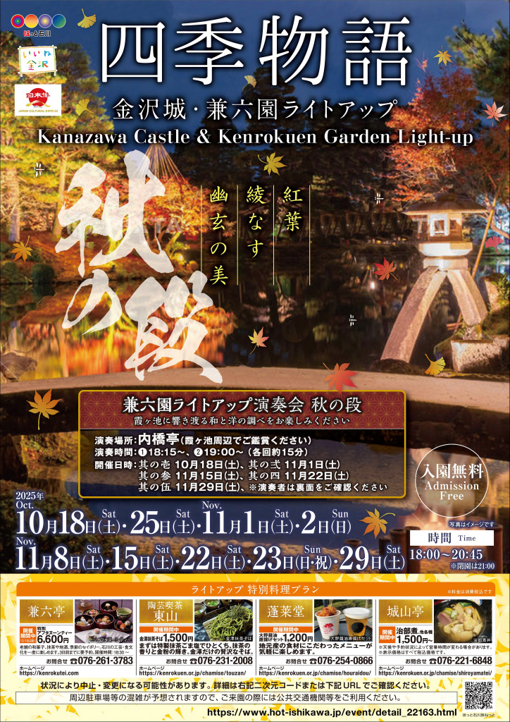 『金沢城・兼六園四季物語 秋の段〜金沢城・兼六園ライトアップ〜』が2025年10月18日(土)から11月29日(土)の週末に開催されます
