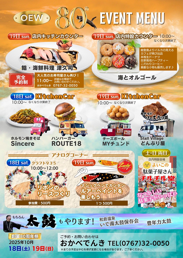 『岡部電機商会 創業80周年イベント』が石川県羽咋郡志賀町の「岡部電機商会」で2025年10月18日(土)、10月19日(日)に開催されます