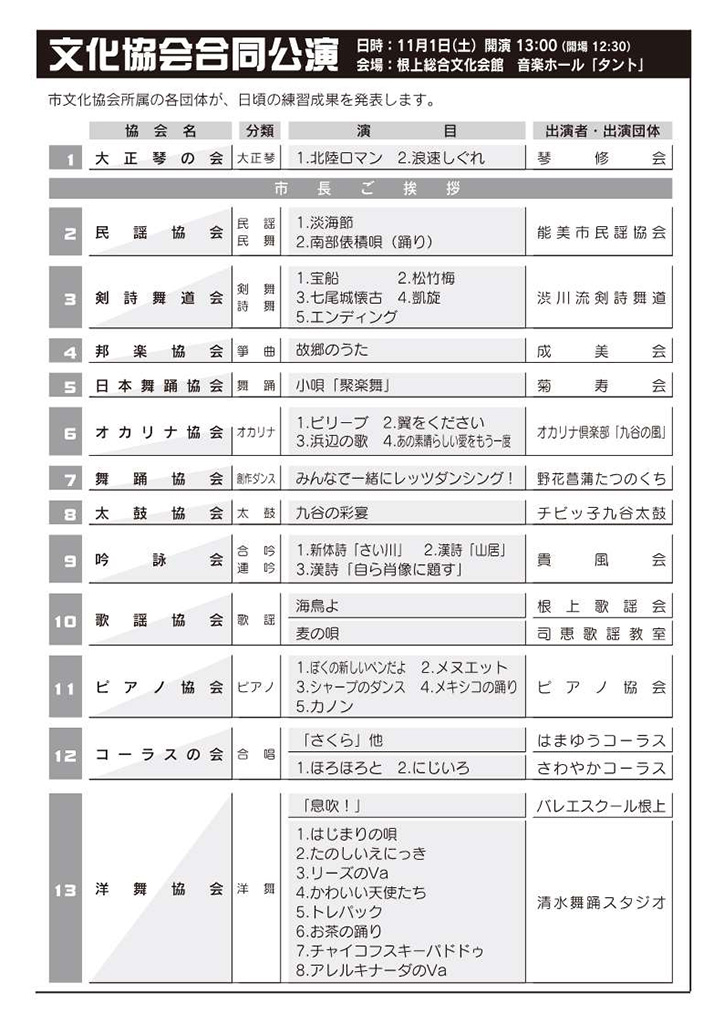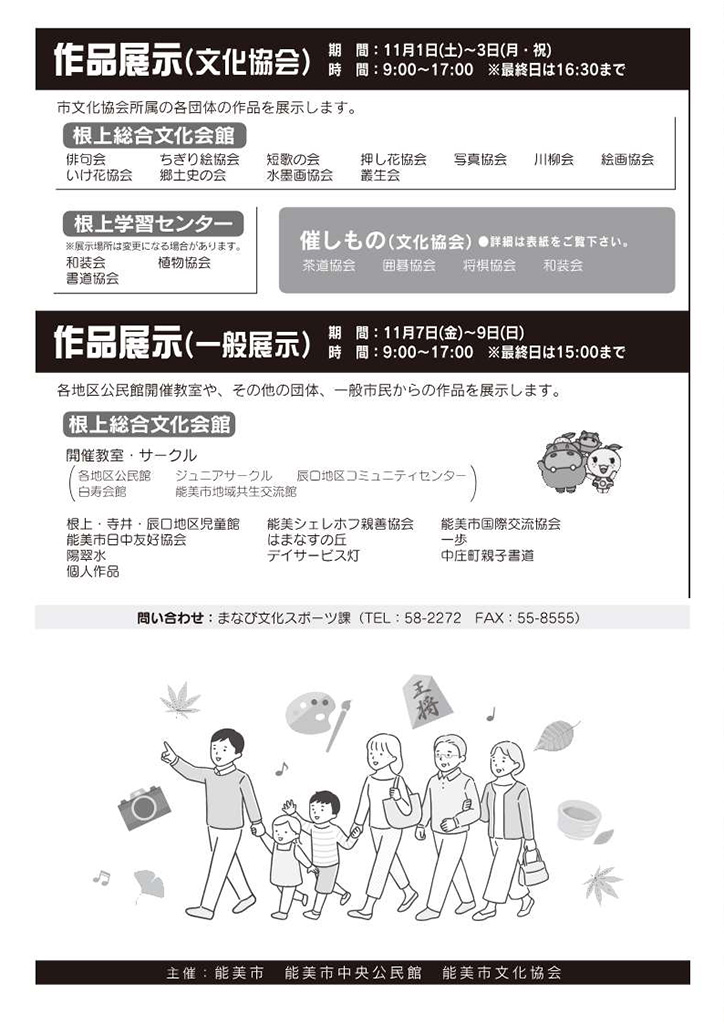 内容 | [文化祭作品展示] 11月1日(土)〜11月3日(月祝)……文化協会展示 11月7日(金)〜11月9日(日)……一般展示 [文化祭発表部門] 11月1日(土)……文化協会合同公演 11月8日(土)……市民文化・芸能大会 |