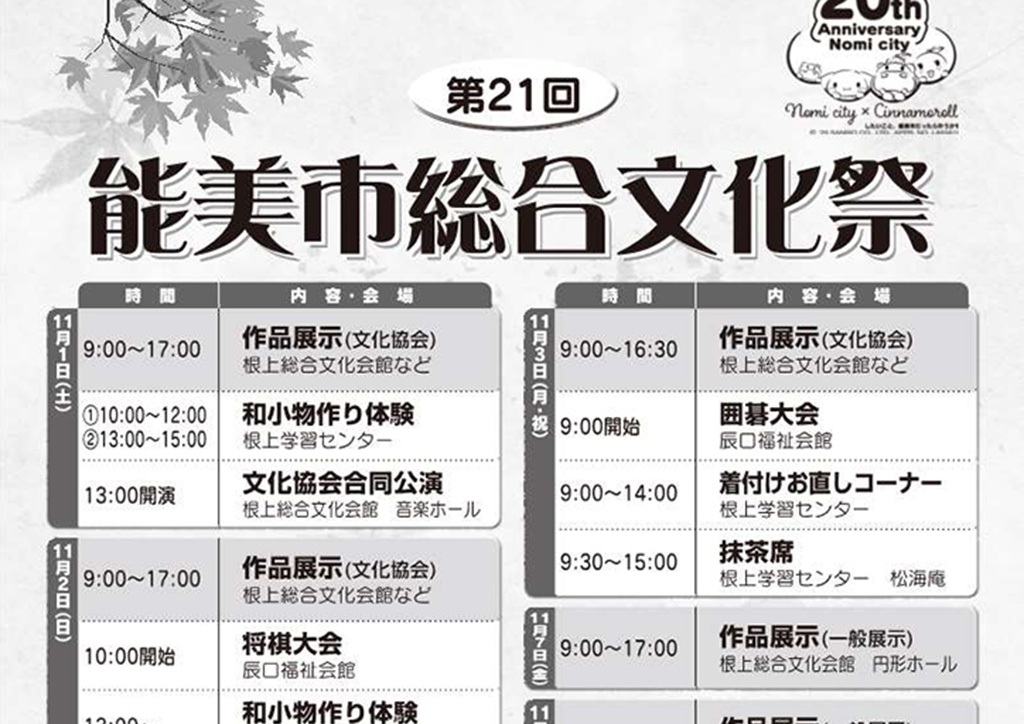 11月1日(土)から11月3日(月祝)、11月7日(金)から11月9日(日)までの期間、石川県能美市の「根上総合文化会館・根上学習センター」にて『能美市誕生20周年記念 第21回能美市総合文化祭』が開催されます