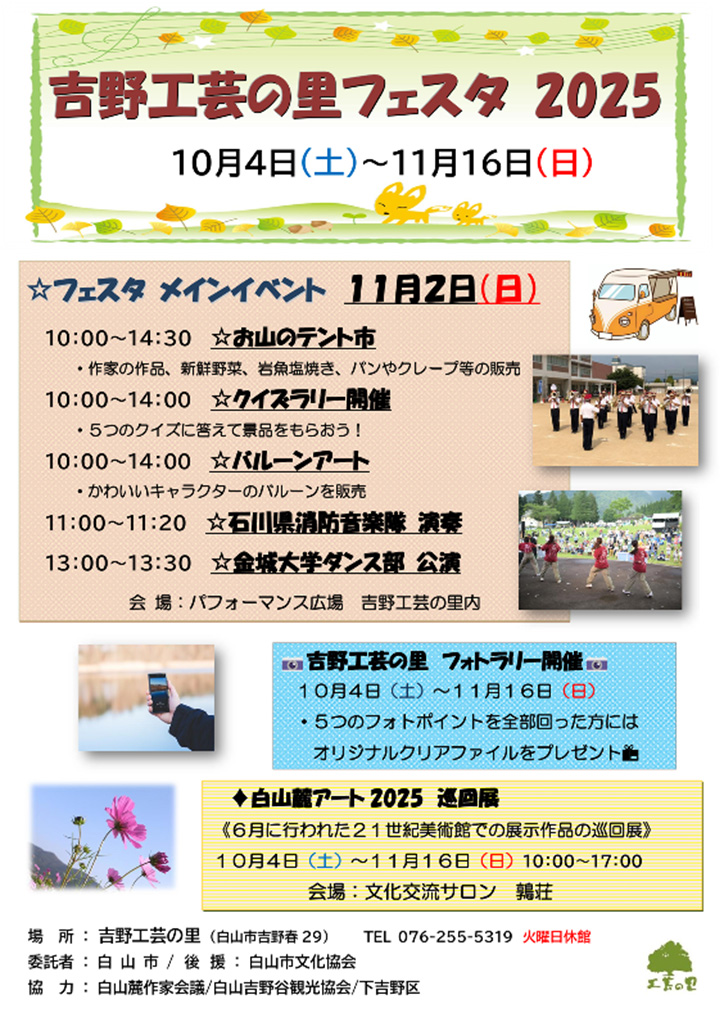 『吉野工芸の里フェスタ2025 メインイベント』が石川県白山市の「吉野工芸の里」で2025年11月2日(日)に開催されます
