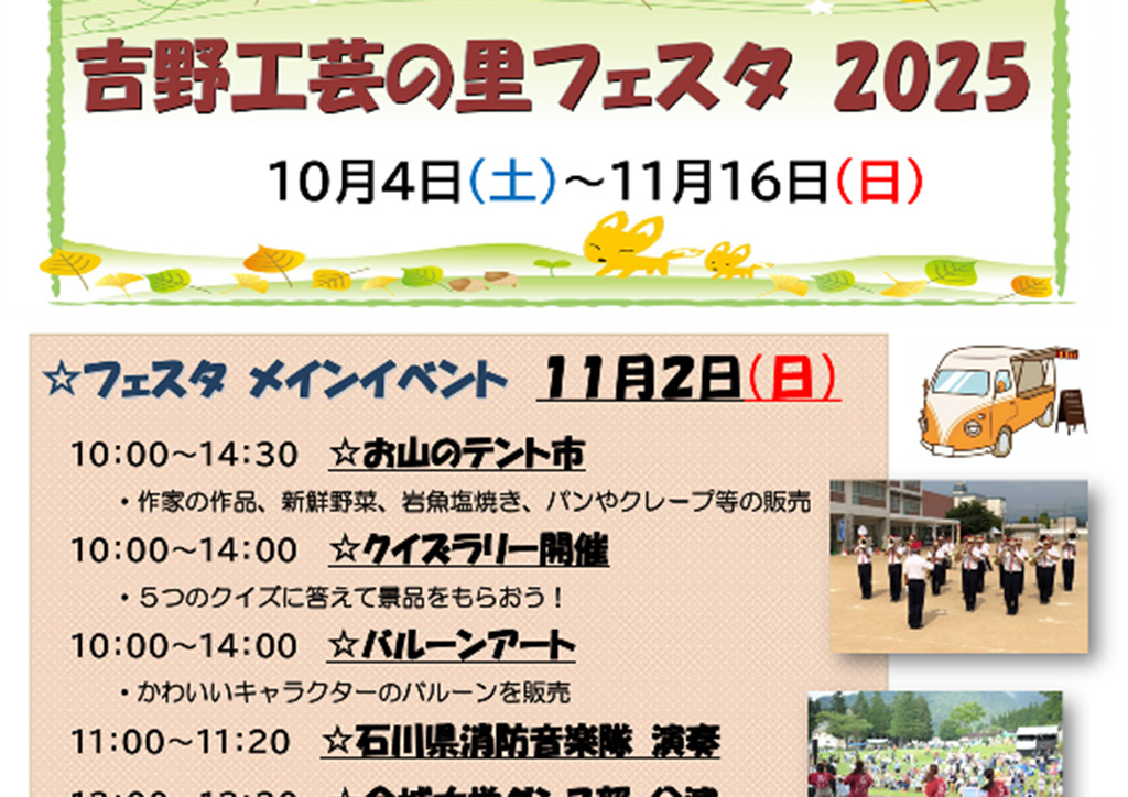 『吉野工芸の里フェスタ2025 メインイベント』が石川県白山市の「吉野工芸の里」で2025年11月2日(日)に開催されます