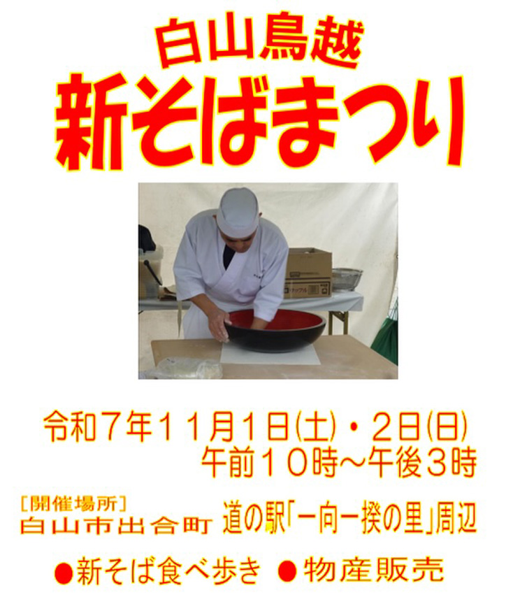 『白山鳥越 新そばまつり』が石川県白山市の「道の駅一向一揆の里周辺」で2025年11月1日(土)、11月2日(日)に開催されます
