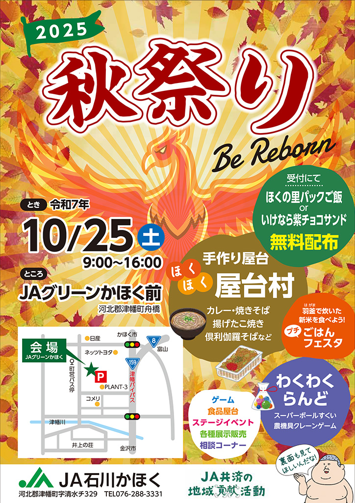 『JA石川かほく 秋祭り』が石川県河北郡津幡町の「JAグリーンかほく」で2025年10月25日(土)に開催されます