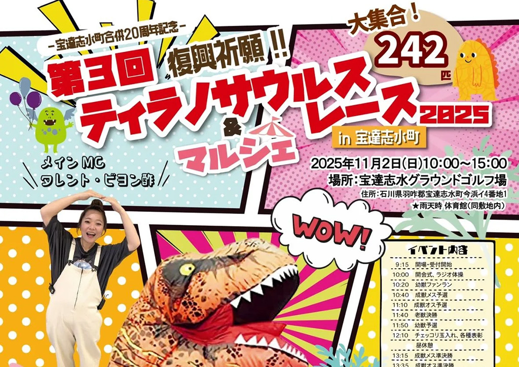 『第3回 復興祈願 ティラノサウルスレース&マルシェ2025 in 宝達志水町』が石川県羽咋郡宝達志水町の「宝達志水グラウンドゴルフ場」で2025年11月2日(日)に開催されます