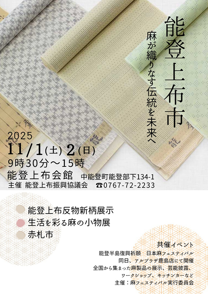 『能登上布市―麻が織りなす伝統を未来へ―』が石川県鹿島郡中能登町の「能登上布会館」で、また『第11回日本麻フェスティバルin中能登町』が同じく中能登町の「アル・プラザ鹿島」で2025年11月1日(土)、11月2日(日)に開催されます