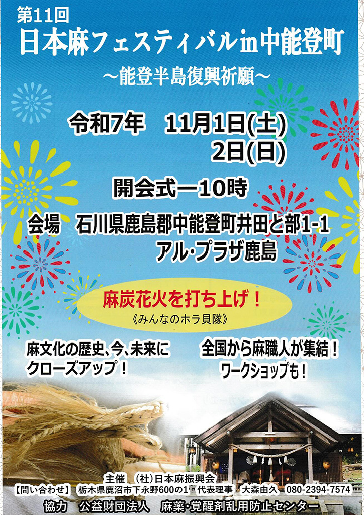 11月1日(土)、11月2日(日)に石川県鹿島郡中能登町の「アル・プラザ鹿島」にて『第11回日本麻フェスティバルin中能登町〜能登半島復興祈願〜』が開催されます