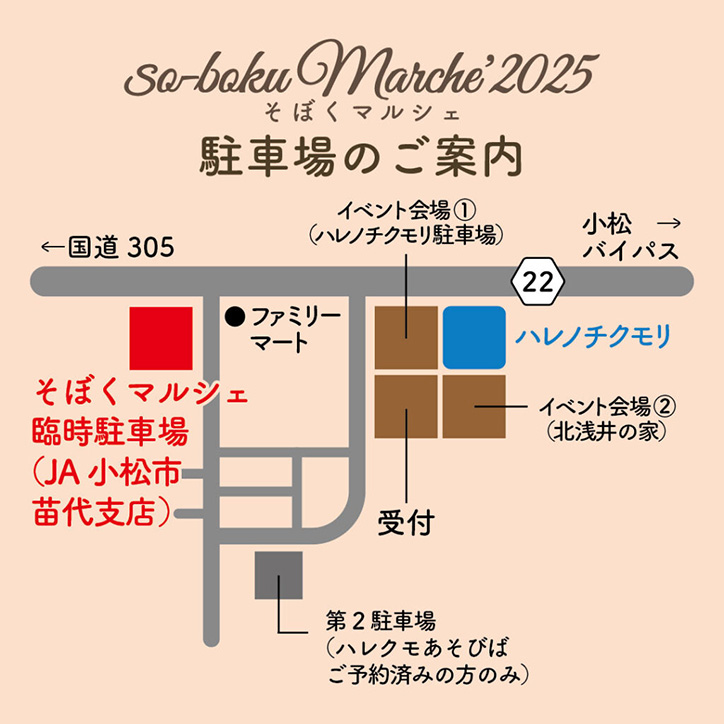 ※当日、会場前の駐車場は車を停められません。JA小松市苗代支店駐車場をご利用ください