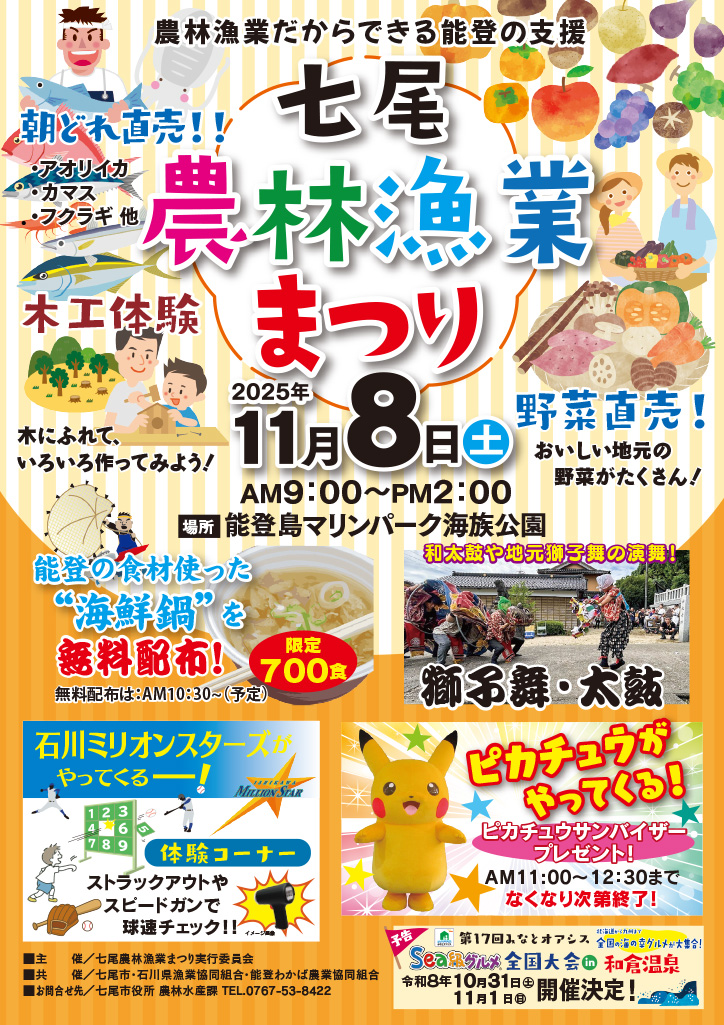 11月8日(土)に石川県七尾市の「能登島マリンパーク」にて『七尾農林漁業まつり』が開催されます