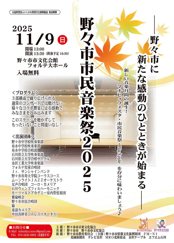 11月9日(日)に石川県野々市市の「野々市市文化会館フォルテ」にて『野々市市民音楽祭2025』が開催されます