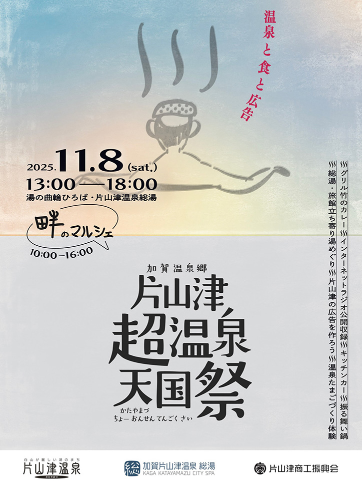 11月8日(土)に石川県加賀市の「湯の曲輪ひろば」にて『片山津超温泉天国祭 -温泉と食と広告-』が開催されます