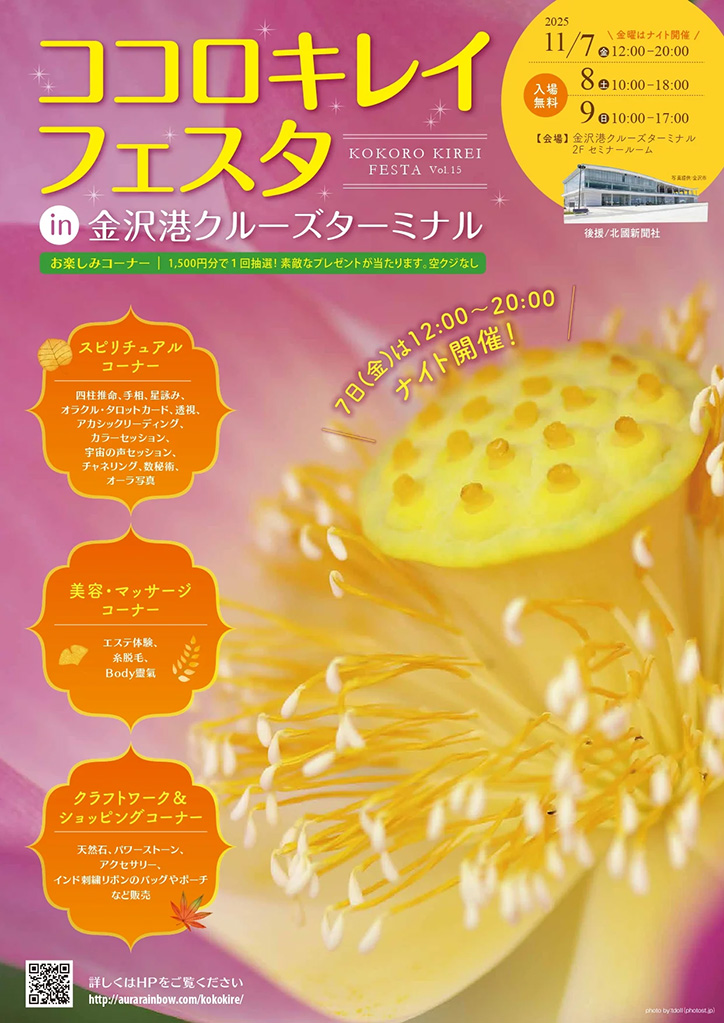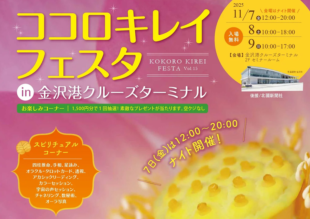 11月7日(金)から11月9日(日)の期間、石川県金沢市の「金沢港クルーズターミナル」にて『ココロキレイフェスタ』が開催されます