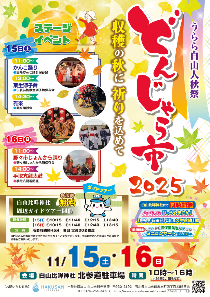『うらら白山人秋祭 どんじゃら市2025』が石川県白山市の「白山比咩神社 北参道駐車場」で2025年11月15日(土)、11月16日(日)に開催されます