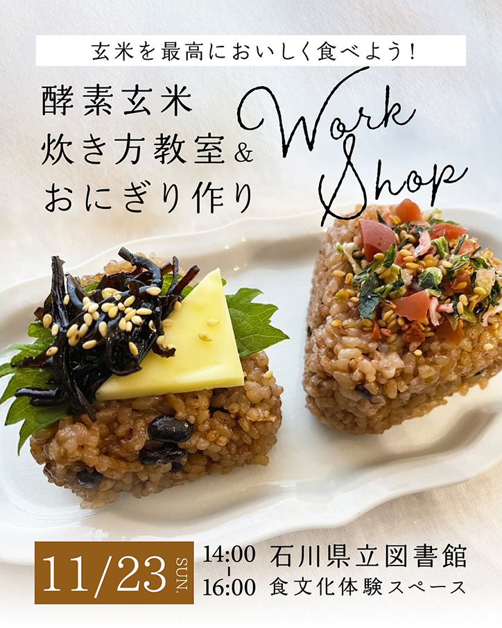 11月23日(日)に石川県金沢市の「石川県立図書館 食文化体験スペース」にて『玄米を最高に美味しく食べよう!《酵素玄米炊き方教室&おにぎり作りワークショップ》』が開催されます