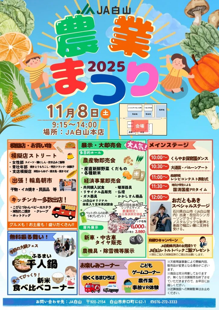 11月8日(土)に石川県白山市の「JA白山 本店・よらんかいねぇ広場」にて『JA白山農業まつり』が開催されます
