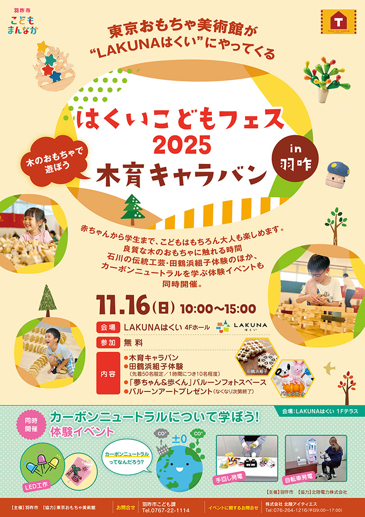 11月16日(日)に石川県羽咋市の「LAKUNAはくい」にて『はくいこどもフェス2025~木育キャラバン~』が開催されます