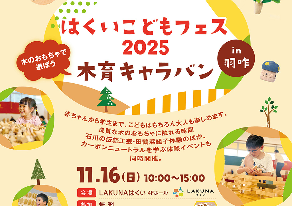 11月16日(日)に石川県羽咋市の「LAKUNAはくい」にて『はくいこどもフェス2025~木育キャラバン~』が開催されます