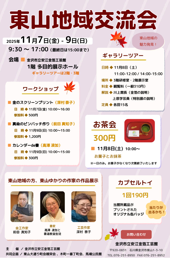 『東山地域交流会』が石川県金沢市の「金沢安江金箔工芸館 1階 多目的展示ホール」で2025年11月7日(金)から11月9日(日)まで開催されます