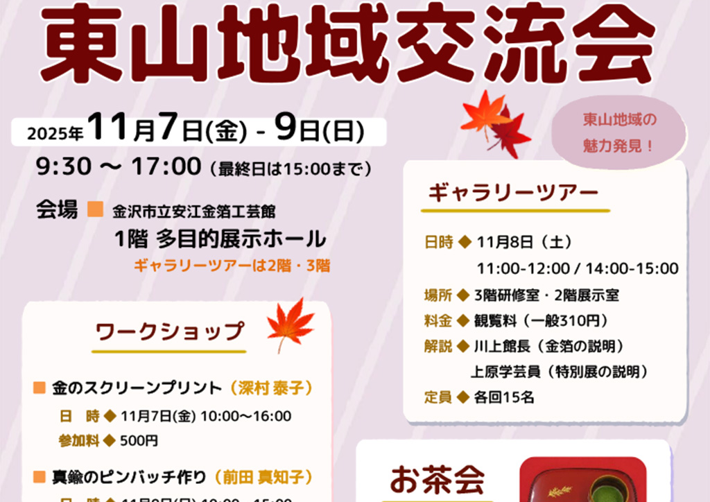 『東山地域交流会』が石川県金沢市の「金沢安江金箔工芸館 1階 多目的展示ホール」で2025年11月7日(金)から11月9日(日)まで開催されます