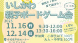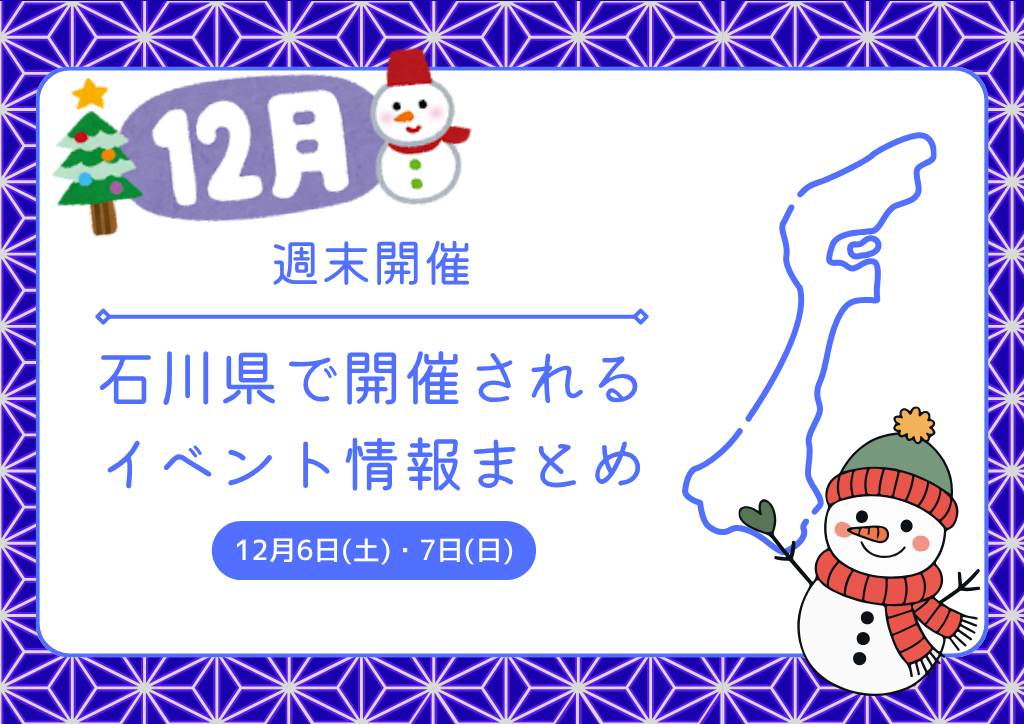 石川県で今週末(12/6-7)開催のイベント情報まとめ 石川イベント週末開催イベント開催 X Facebook はてブ LINE 2025.11.18 スポンサーリンク 石川県で週末、12月6日(土)、12月7日(日)に開催されるイベント情報をまとめました 目次 12/6(土)、12/7(日)開催イベント金沢で今週末開催されるイベント(12/6,12/7)[12/6-7]箔押体験ワークショップ『煌めきのクリスマスオーナメントづくり』が箔座本店で開催(金沢)能登で今週末開催されるイベント(12/6,12/7)[12/6]自然体験&昔遊び教室『里山の植物でリース作り』がのと里山里海ミュージアムで開催(能登七尾)小松市で今週末開催されるイベント(12/6,12/7)[11/16,12/14]いしかわ親子ボードゲーム会が小松市芦城センターで開催(小松市)前週から開催中のイベント[10/25-12/25]能美市誕生20周年記念「能美市デジタルスタンプラリーin健康ロード」が能美市で開催[10/23-3/27]金沢芸妓の舞が石川県立音楽堂・石川県立能楽堂で開催(金沢)[10/1-3/31]山中温泉スイーツめぐりが山中温泉で開催(加賀)[2/1-3/31]羽生結弦選手による石川県応援企画開催!石川県内各地の観光施設に等身大パネルやポスターが! 12/6(土)、12/7(日)開催イベント 金沢で今週末開催されるイベント(12/6,12/7) [12/6-7]箔押体験ワークショップ『煌めきのクリスマスオーナメントづくり』が箔座本店で開催(金沢) [12/6-7]箔押体験ワークショップ『煌めきのクリスマスオーナメントづくり』が箔座本店で開催(金沢)箔押体験ワークショップ『煌めきのクリスマスオーナメントづくり』が石川県金沢市の「箔座本店」で2025年12月6日(土)、... 能登で今週末開催されるイベント(12/6,12/7) [12/6]自然体験&昔遊び教室『里山の植物でリース作り』がのと里山里海ミュージアムで開催(能登七尾) [12/6]自然体験&昔遊び教室『里山の植物でリース作り』がのと里山里海ミュージアムで開催(能登七尾)自然体験&昔遊び教室『里山の植物でリース作り』が石川県七尾市の「のと里山里海ミュージアム」で2025年12月6日(土)に... 小松市で今週末開催されるイベント(12/6,12/7) [11/16,12/14]いしかわ親子ボードゲーム会が小松市芦城センターで開催(小松市) [11/16,12/14]いしかわ親子ボードゲーム会が小松市芦城センターで開催(小松市)『いしかわ親子ボードゲーム会』が石川県小松市の「小松市芦城センター」で2025年11月16日(日)と12月14日(日)に... 前週から開催中のイベント [10/25-12/25]能美市誕生20周年記念「能美市デジタルスタンプラリーin健康ロード」が能美市で開催 [10/25-12/25]能美市誕生20周年記念「能美市デジタルスタンプラリーin健康ロード」が能美市で開催『能美市誕生20周年記念「能美市デジタルスタンプラリーin健康ロード」』が石川県能美市内で2025年10月25日(土)か... [10/23-3/27]金沢芸妓の舞が石川県立音楽堂・石川県立能楽堂で開催(金沢) [10/23-3/27]金沢芸妓の舞が石川県立音楽堂・石川県立能楽堂で開催(金沢)『金沢芸妓の舞』が石川県金沢市の「石川県立音楽堂」および「石川県立能楽堂 別館」で2025年10月23日(木)から202... [10/1-3/31]山中温泉スイーツめぐりが山中温泉で開催(加賀) [10/1-3/31]山中温泉スイーツめぐりが山中温泉で開催(加賀)『山中温泉スイーツめぐり』が石川県加賀市山中温泉で2025年10月1日(水)から2026年3月31日(火)まで開催されま... [2/1-3/31]羽生結弦選手による石川県応援企画開催!石川県内各地の観光施設に等身大パネルやポスターが! 羽生結弦選手による石川県応援企画開催!石川県内各地の観光施設に等身大パネルやポスターが!プロフィギュアスケーター羽生結弦さんによる石川県応援企画が実施されます!令和7(2025)年2月1日(土)から令和8(2...