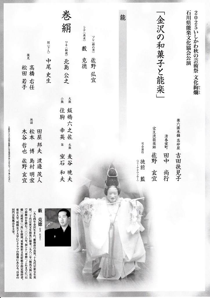 2025いしかわ秋の芸術祭 文化絢爛 石川県能楽文化協会公演『金沢の能と和菓子』が石川県金沢市の「石川県立能楽堂」で2025年11月16日(日)に開催されます