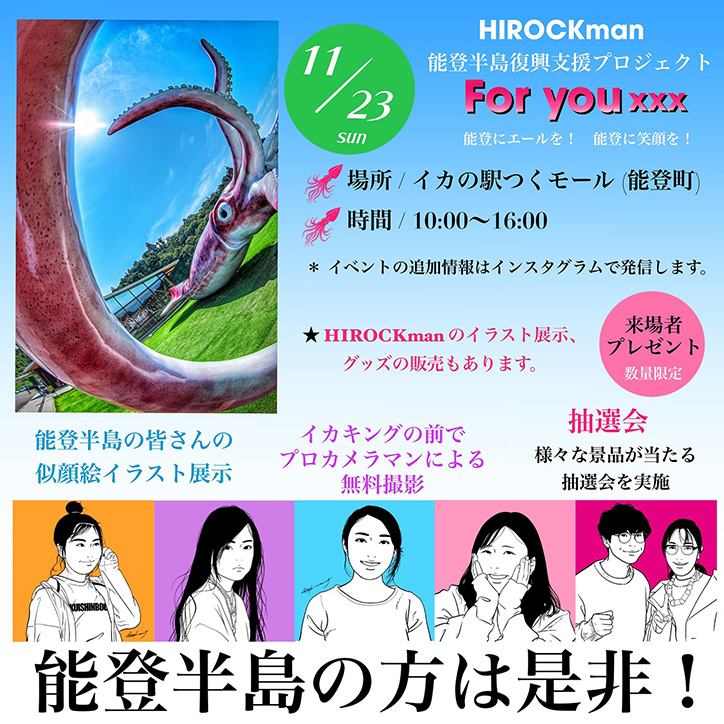 11月23日(日)に石川県鳳珠郡能登町の「イカの駅つくモール」にて、HIROCKman 能登半島復興支援プロジェクト『For You xxx 〜能登にエールを!能登に笑顔を!〜』が開催されます