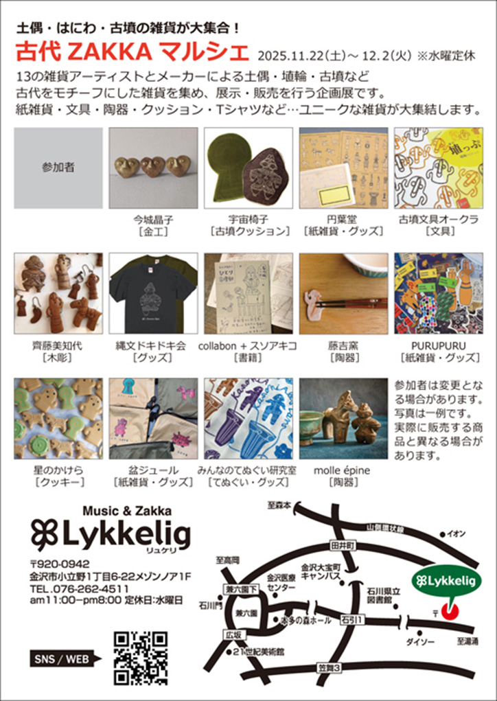 11月22日(土)から12月2日(火)までの期間、石川県金沢市の「Music & Zakka Lykkelig(リュケリ)」にて『古代ZAKKAマルシェ』が開催されます