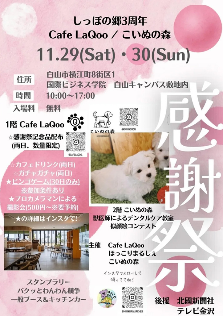 11月29日(土)、11月30日(日)に石川県白山市のドッグカフェ「Café LaQoo」にて『しっぽの郷3周年祭〜ほっこりマルシェ×ドッグカフェCafé LaQoo×こいぬの森〜』が開催されます