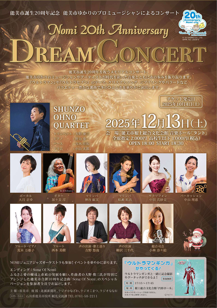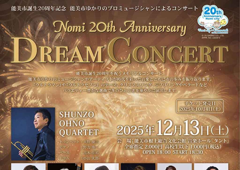 12月13日(土)に石川県能美市の「根上総合文化会館 タント」にて『能美市誕生20周年記念 能美市ゆかりのプロミュージシャンによるコンサート』が開催されます
