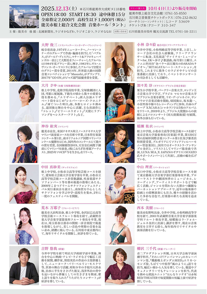 能美市誕生20周年記念 能美市ゆかりのプロミュージシャンによるコンサート@根上総合文化会館 タント 出演者