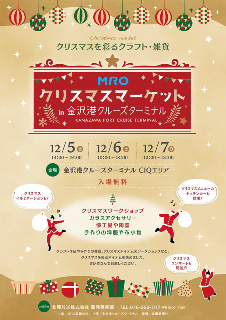 12月5日(金)から12月7日(日)まで石川県金沢市の「金沢港クルーズターミナル」にて『MROクリスマスマーケット in 金沢港クルーズターミナル』が開催されます