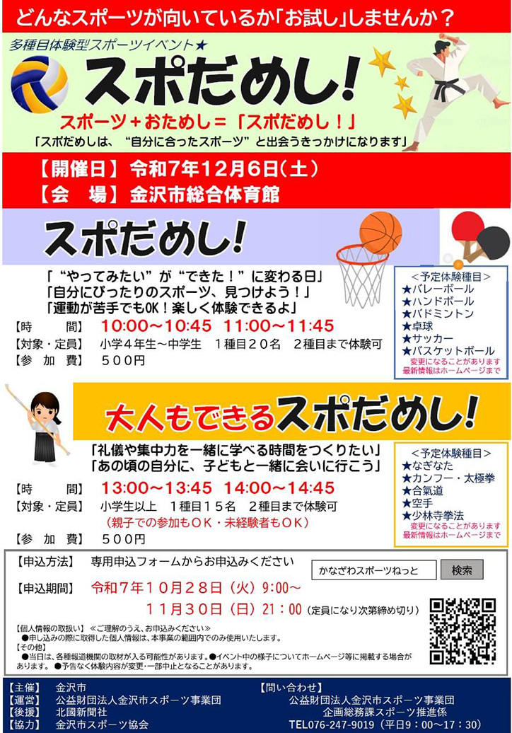 『多種目体験型スポーツイベント「スポだめし!大人もできるスポだめし!」』が石川県金沢市の「金沢市総合体育館」で2025年12月6日(土)に開催されます