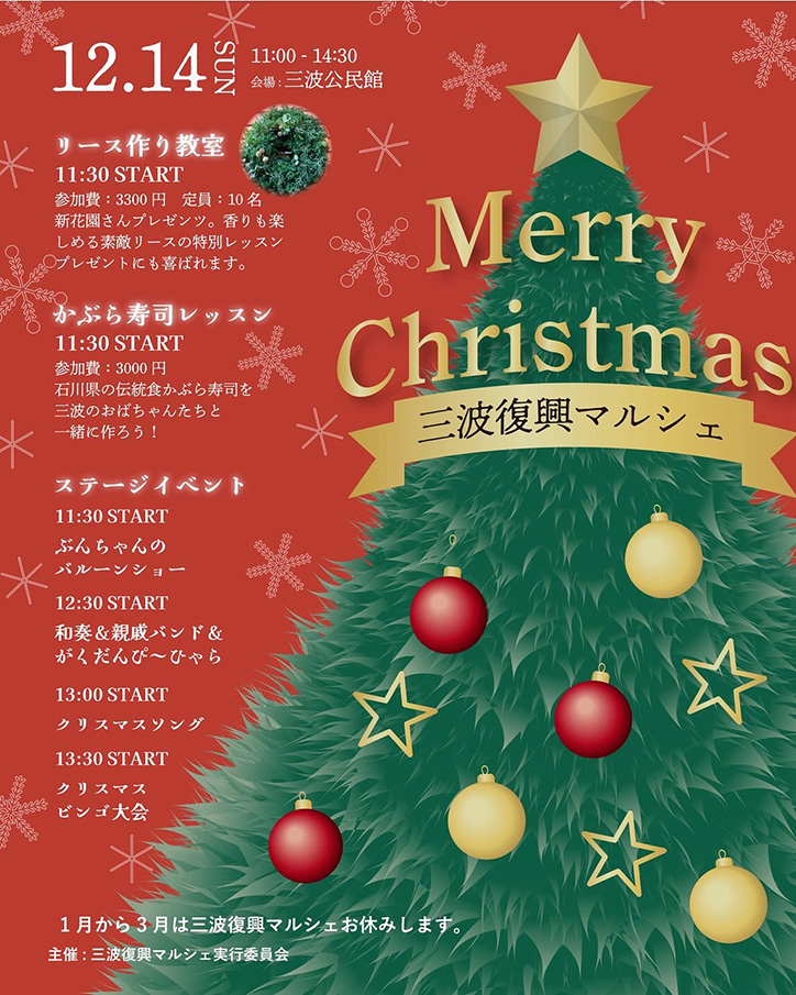 ぜひご家族やお友達と『クリスマス三波復興マルシェ』に出かけてみませんか
