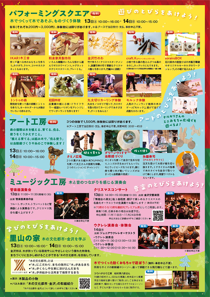 など、“森のとびらをあけよう!”をテーマに、「木を植えて育てる、伐って使う」森の循環を体感したり、木の文化都市・金沢を学びながら、木のおもちゃで遊べる無料コーナーなど盛りだくさん♪